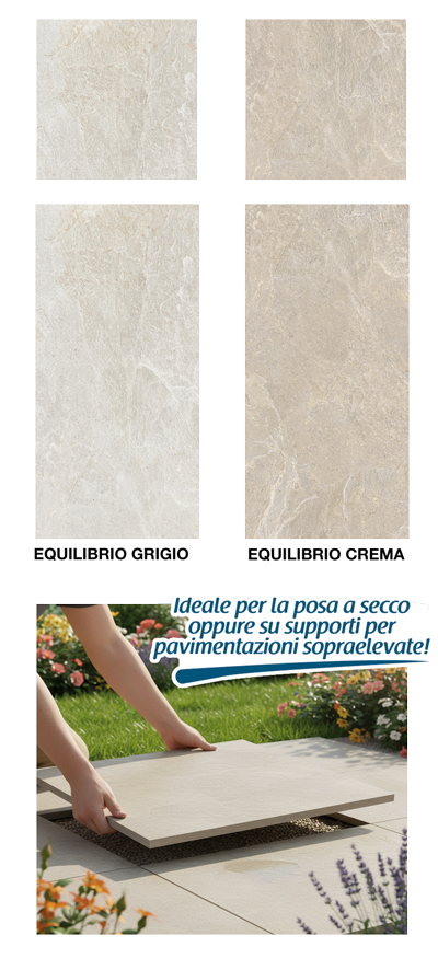 La linea di pavimentazioni in gres porcellanato Equilibrio è la scelta ideale per valorizzare ogni ambiente outdoor con eleganza e sobrietà. Le piastrelle, nello spessore di 2 cm, presentano bordi studiati per facilitare la posa – anche a secco – e sono completamente rettificate su tutti i lati, garantendo superfici impeccabili. Una gamma ampia e articolata di finiture e colori permette di soddisfare le diverse tipologie di ambientazione, adattandosi con armonia a ogni stile di spazio esterno. La colorazione in massa garantisce una elevata resistenza all’abrasione; il colore rimane costante e inalterato nel tempo.