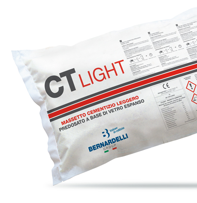 CT LIGHT è un massetto leggero predosato idoneo per la realizzazione di massetti interni ed esterni a media essiccazione aderenti, non aderenti (desolidarizzati) e galleggianti. Pedonabile dopo 10 ore dalla posa, può ricevere dopo 48 ore rivestimenti ceramici, cotto e pietra naturale. Per rivestimenti sensibili all’umidità come legno, linoleum, moquette, il tempo di attesa è di 8-10 gg. CT LIGHT contiene in sezioni separate aggregati silico-calcarei, vetro espanso riciclato e cemento Portland. ✔ Conforme alla Norma Europea EN 13813 |