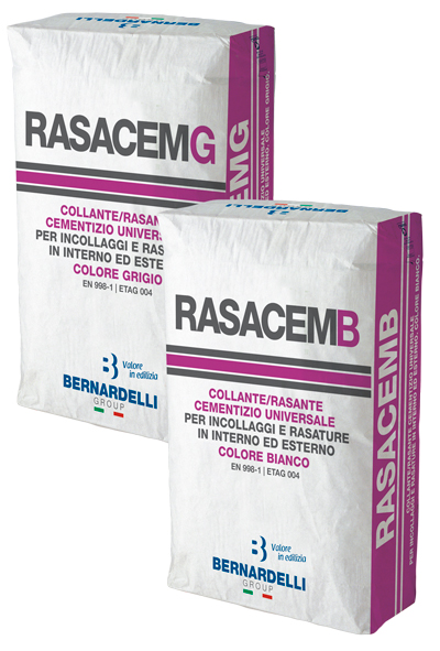 RASACEM è un collante/rasante cementizio premiscelato in polvere, disponibile in due colorazioni: RASACEM G (grigio) e RASACEM B (bianco). La presenza all’interno del formulato di aggregati silico-calcarei selezionati, cariche minerali, cemento Portland ad alta resistenza, co-polimeri e additivi specifici rende il prodotto particolarmente lavorabile e di facile messa in opera. RASACEM è conforme alle linee guida ETAG 004 come adesivo e rasante per sistemi di isolamento termico a cappotto ETICS (External Thermal Insulation Composite System) e rispetta la norma: |