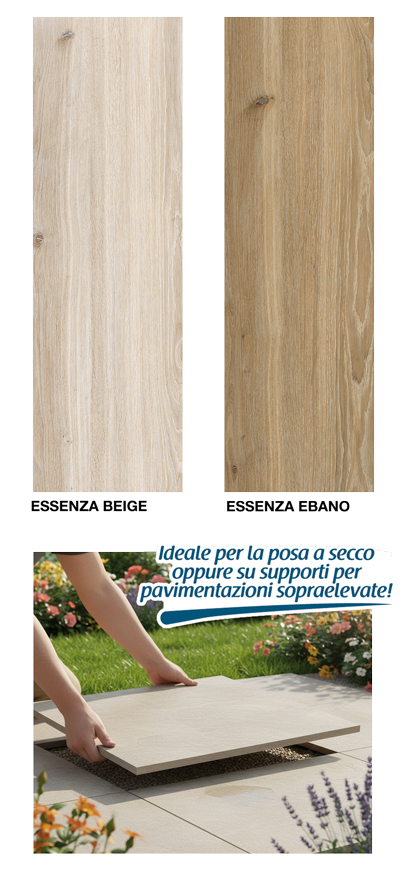 La linea di pavimentazioni in gres porcellanato Essenza è la scelta ideale per valorizzare ogni ambiente outdoor con eleganza e sobrietà. Le piastrelle, nello spessore di 2 cm, presentano bordi studiati per facilitare la posa – anche a secco – e sono completamente rettificate su tutti i lati, garantendo superfici impeccabili. Una gamma ampia e articolata di finiture e colori permette di soddisfare le diverse tipologie di ambientazione, adattandosi con armonia a ogni stile di spazio esterno. La colorazione in massa garantisce una elevata resistenza all’abrasione; il colore rimane costante e inalterato nel tempo.