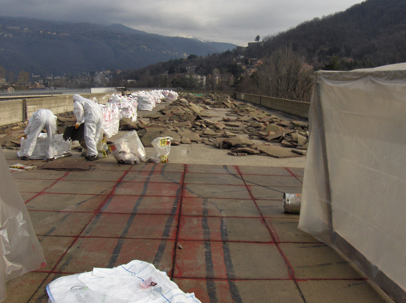 Solo la professionalità e lo scrupolo di un’azienda specializzata nel settore ha permesso di individuare e risolvere un grosso problema come la presenza di amianto nel bitume di incollaggio delle lastre sul tetto. Il trattamento del bitume inquinato è stato appaltato a un’azienda specializzata e il materiale è stato rimosso con smerigliatrici secondo un protocollo concordato con l’ASL di Como. Questo primo intervento ha impegnato le aziende per un periodo di circa due mesi. Successivamente Edilquattro ha proceduto con le demolizioni. La frantumazione del materiale proveniente dalle demolizioni è in fase di realizzazione per poter essere riutilizzato in situ per operazioni di formazione rilevati per la lottizzazione futura.
