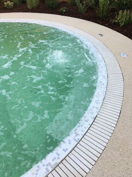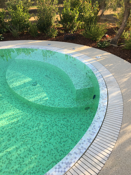 Dopo una serie di campionature fornite dall’azienda, il proprietario ha scelto la colorazione Bianco Italia della collezione i Naturali, realizzata con ciottoli di marmo di granulometria 2/4 millimetri, una soluzione classica e senza tempo, di grande pregio, in armonia con le nuances della villa e con le tonalità chiare del mosaico utilizzato per il rivestimento interno della vasca.
